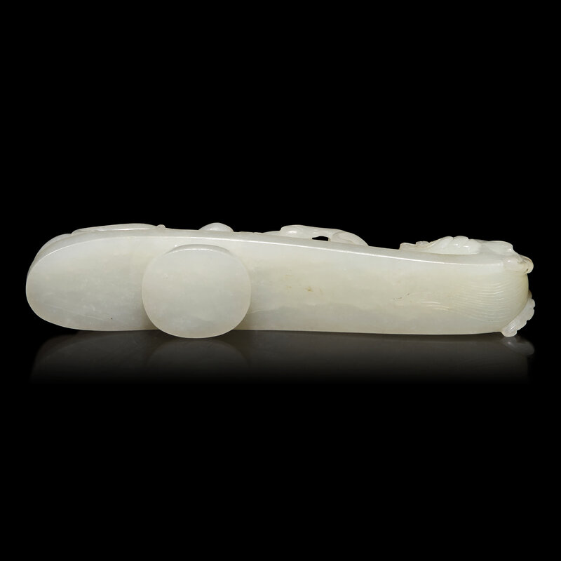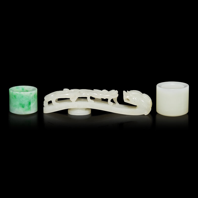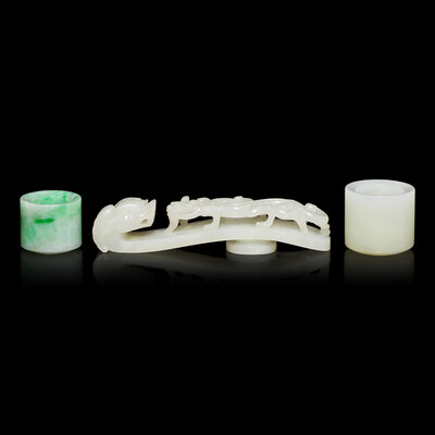 The first a white jade archer's ring, the cylindrical stone of an even colored tone; the second a white jade 'dragon' belt hook; the third an apple green jadeite archer's ring.
