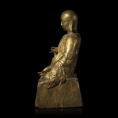 A Mongolian Gilt Copper Repoussé Figure of a Seated Luohan or Monk, 19th Century