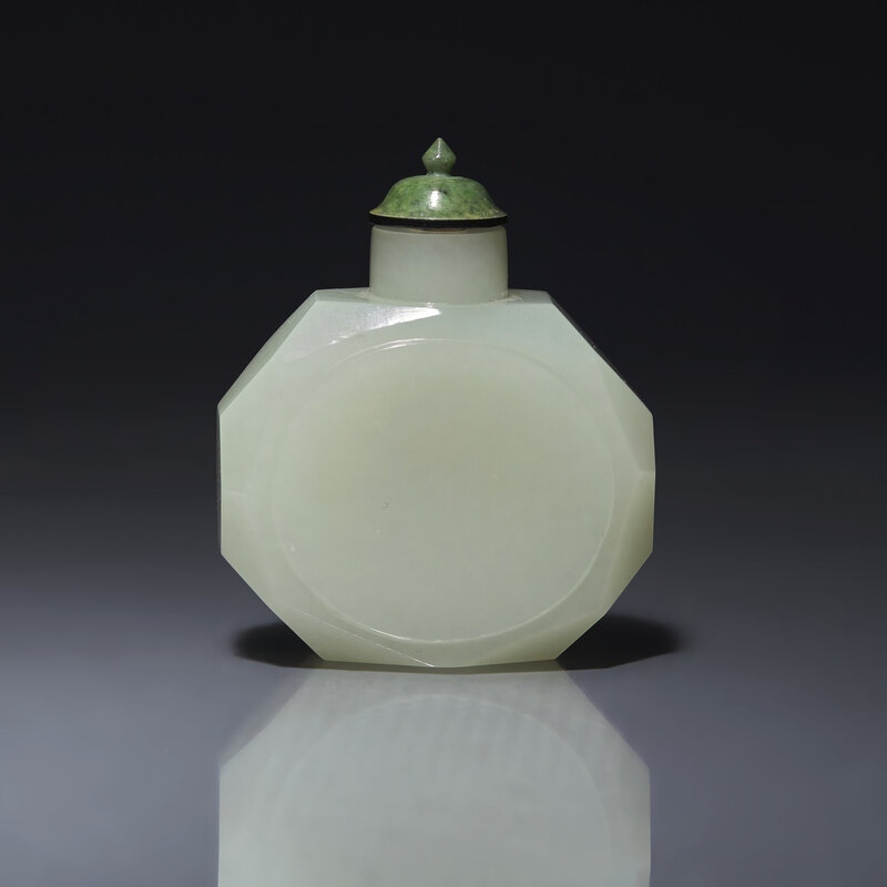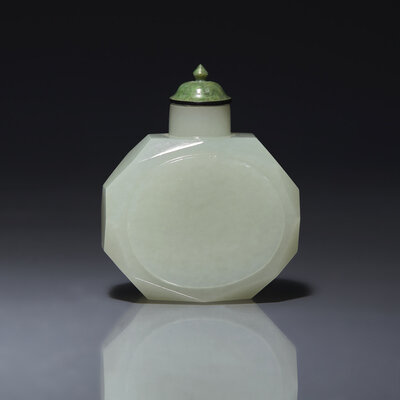 Of faceted octagonal form, the main sides with an oval in low relief, the stone of a very even white tone with slight greyish-celadon undertones.