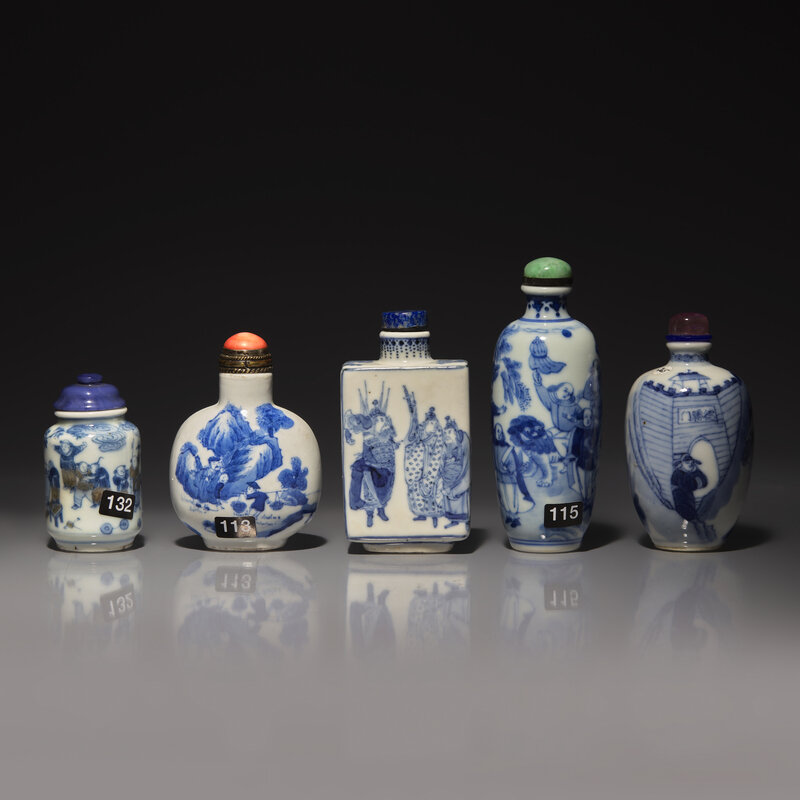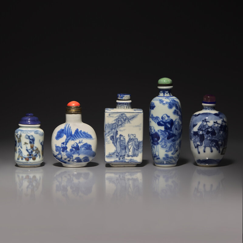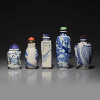 Five Chinese Blue and White Porcelain Snuff Bottles, 19th-Early 20th Century