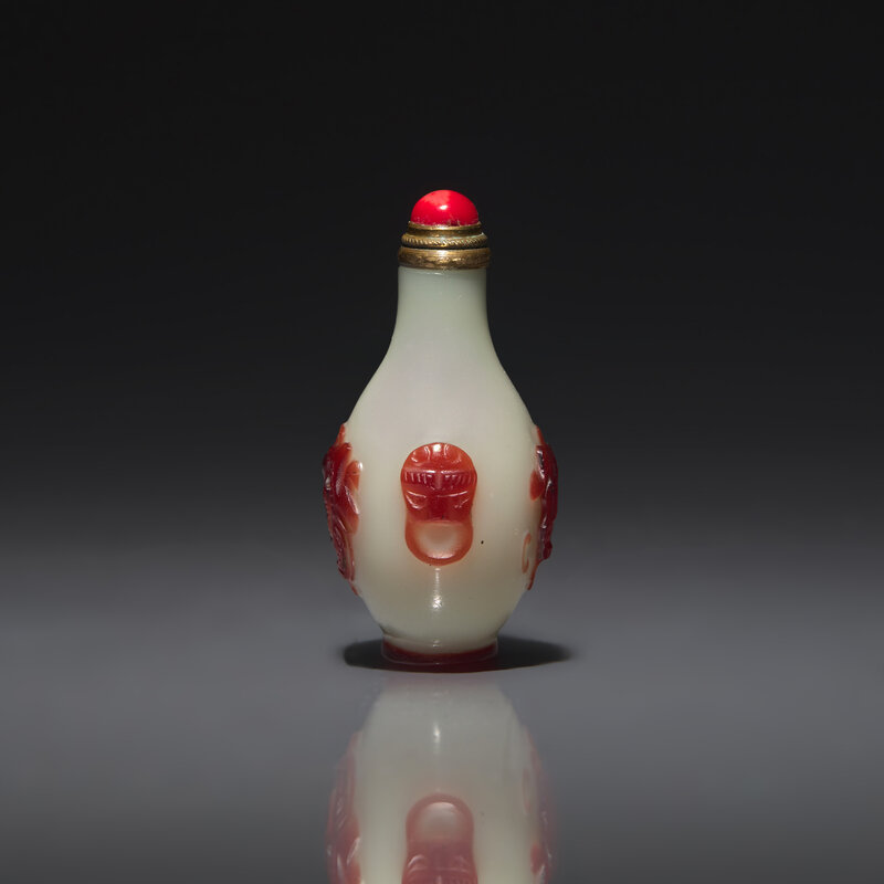 Possibly Imperial, attributed to the Palace Workshops, Beijing; of miniature pear shape, the shoulders sloping to a long cylindrical neck, with red overlay meticulously carved to depict a coiling Chilong on each main side, the narrow sides carved with mask and mock-ring handles, the footrim also carved from the red overlay.