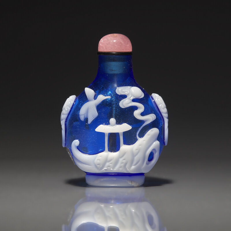 Of flattened circular form, the shoulders sloping to a cylindrical neck, with a flat lip, wide mouth and flat foot surrounded by a protruding oval footrim, the transparent blue body with a milk-white overlay depicting a well-carved seated fisherman beneath a leafy tree, the reverse with a pavilion rising from waves, a bird in flight and the sun above, the narrow sides with mask-and-ring motifs, the footrim also carved from the overlay.
