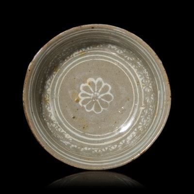 With shallow circular slightly flared cup on tall flared foot, decorated with white-inlaid stamped florets enclosed within border lines.