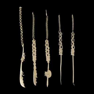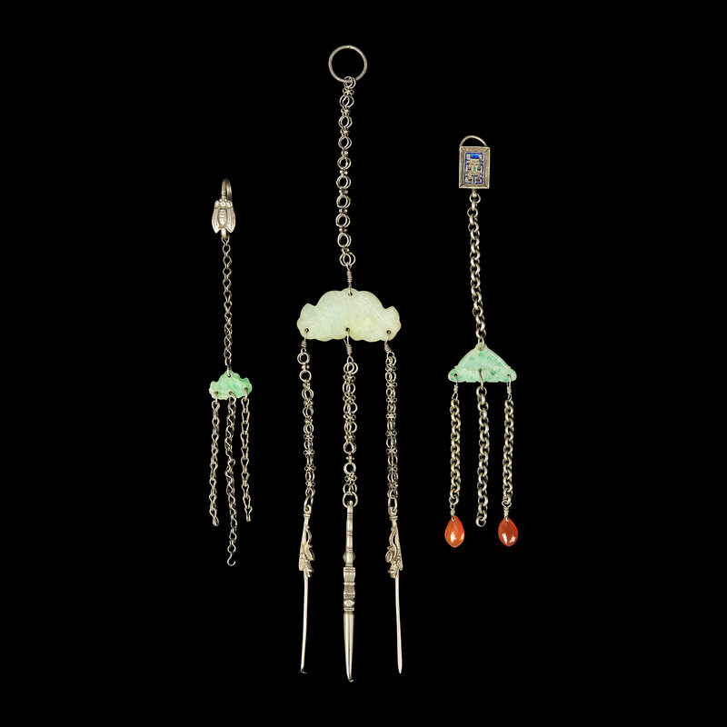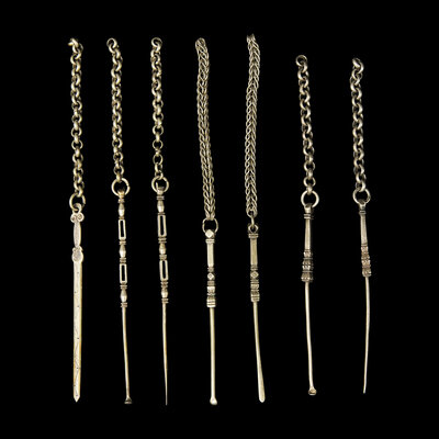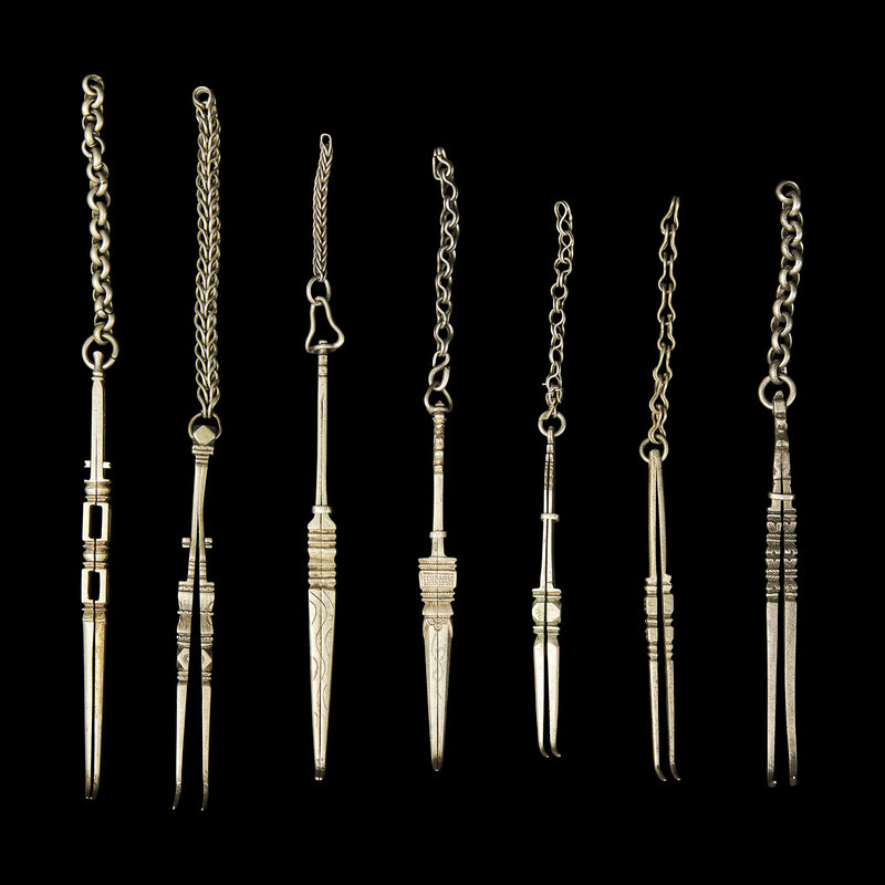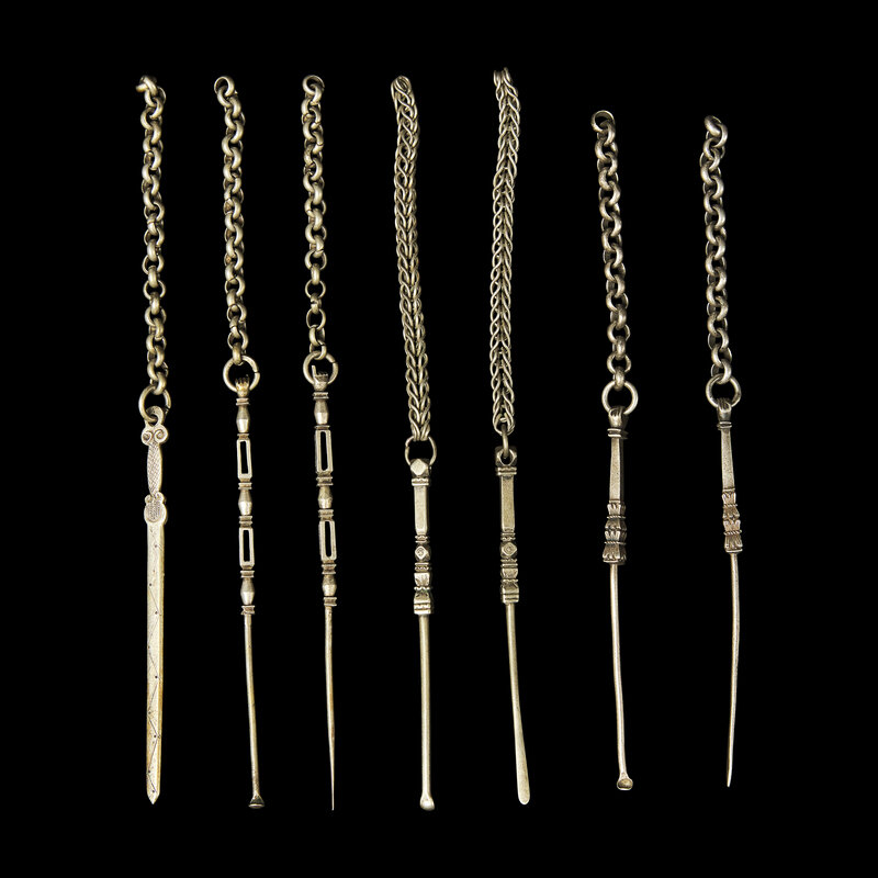 Comprising finely made personal implements traditionally worn or carried by women as part of their daily attire. Such silver accessories, often suspended from belts or kept in pouches, combined practical function with ornamental appeal and reflected the refined taste and social identity of their owners.