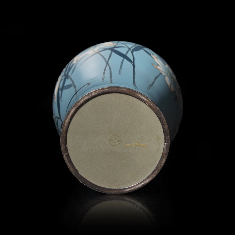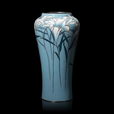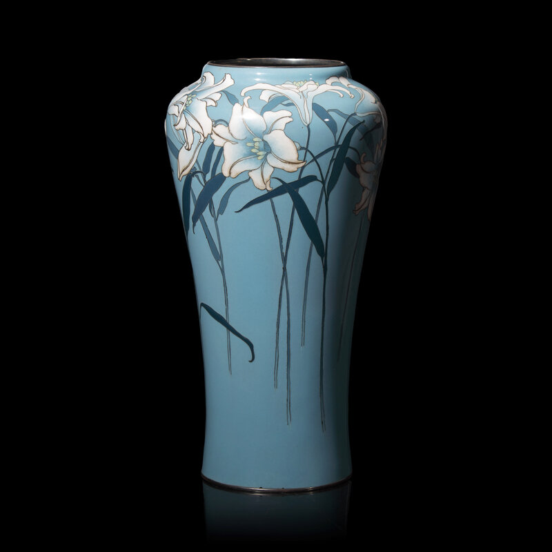 The vase decorated with gracefully shaded lilies in silver wire, musen, and moriage enamels, all set against a light blue background, underside with workshop mark.