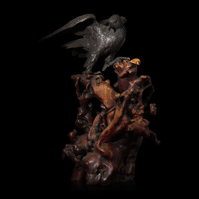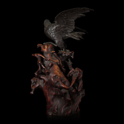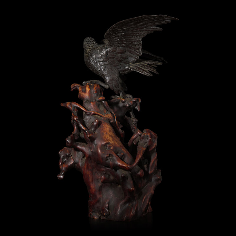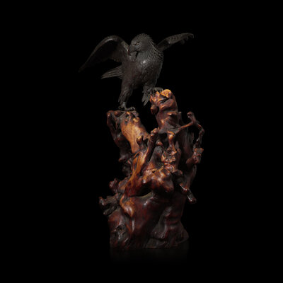 The realistically-depicted raptor alighting on an irregular rootwood stand, its powerful wings extended in a majestic spread, signed.