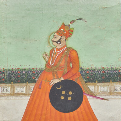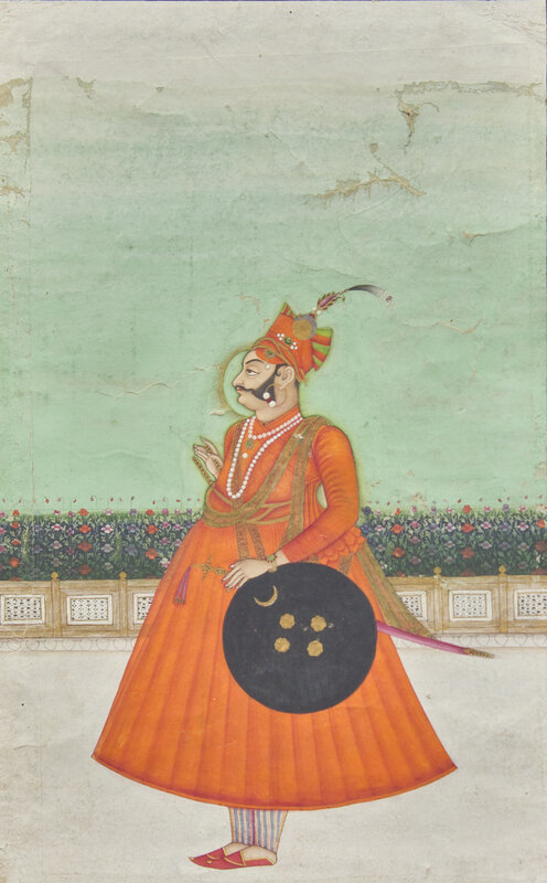 Possibly a portrait of Maharaja Bakhat Singh of Nagaur or his son Vijai Singh, The king standing in profile on a parapet and dressed in an orange angarkha and elaborate turban, adorned with pearl, emerald, and ruby jewelry and caparisoned with a sword, dagger, and shield, the face backed by a golden halo, with a flowering hedge behind and a pale sky.