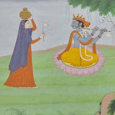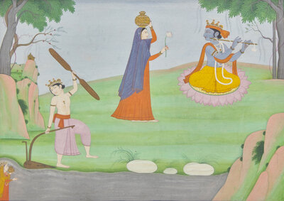 Depicting Balarama using his ploughshare to divert the river Yamuna towards Vrindavan, where Krishna plays his flute, attracting a gopa, center, and the river goddess Yamuna, lower left.