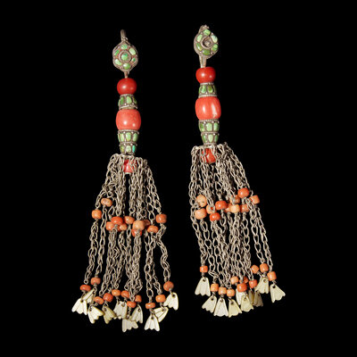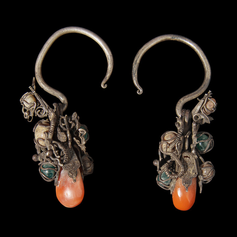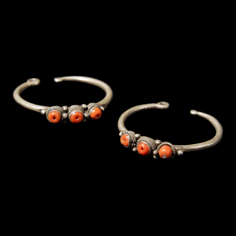 Comprising two pairs of earrings, one pair of bangle bracelets, and a ring. Each piece is inset with agate or coral, set against finely worked silver mounts that emphasize both color and form.