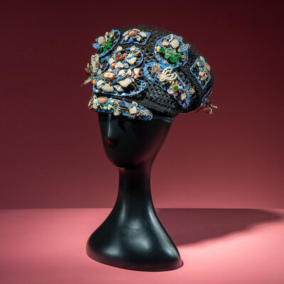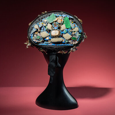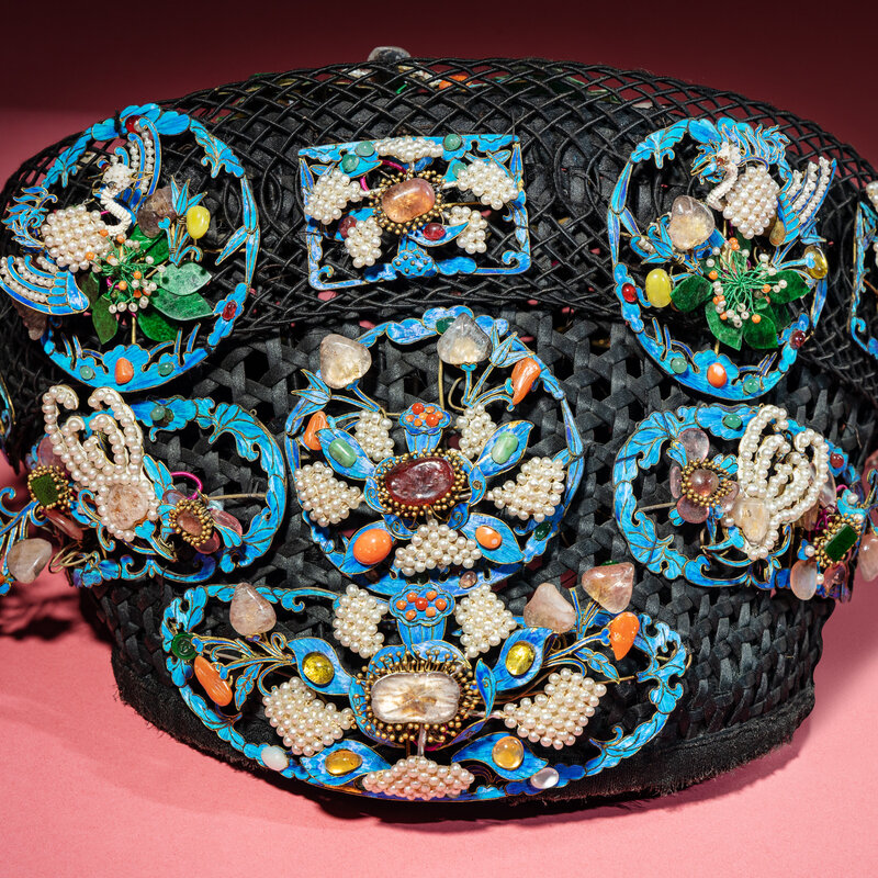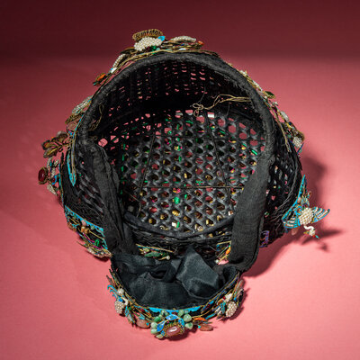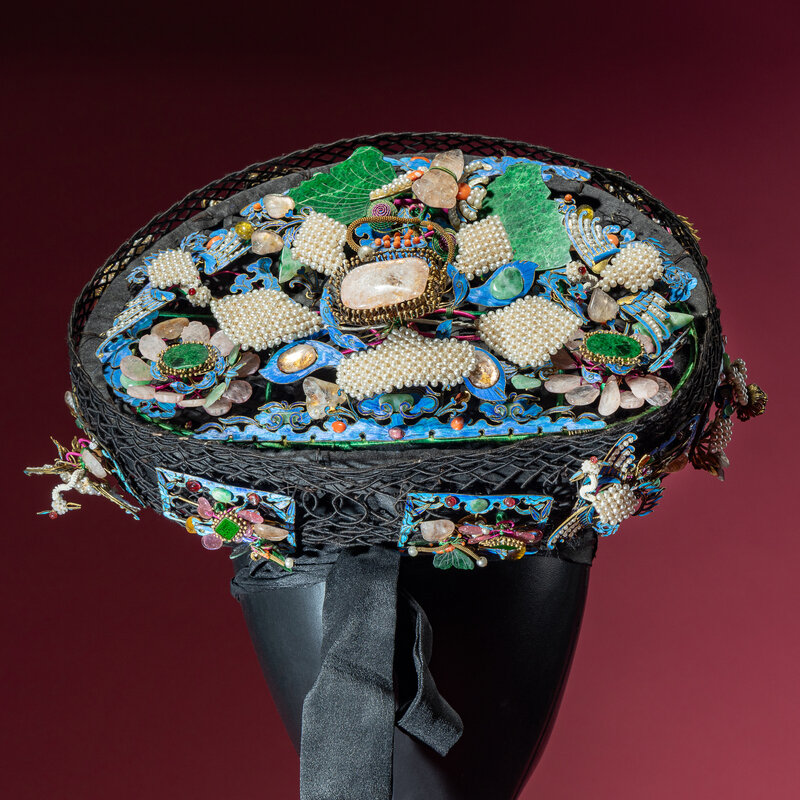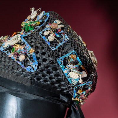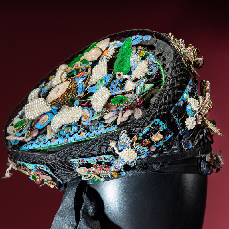 The black silk-woven framework ornately adorned with phoenixes, bats, lingzhi, chime stone, and wan symbols en tremblant amongst stylised clouds and foliate borders, embellished with pearls, coral, jadeite, glass, and other semiprecious stones, stabilised with metal wires, with an associated hairband and stand.