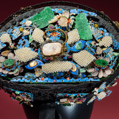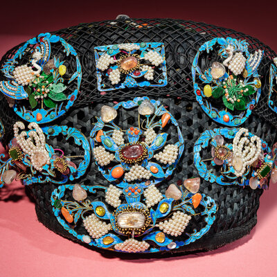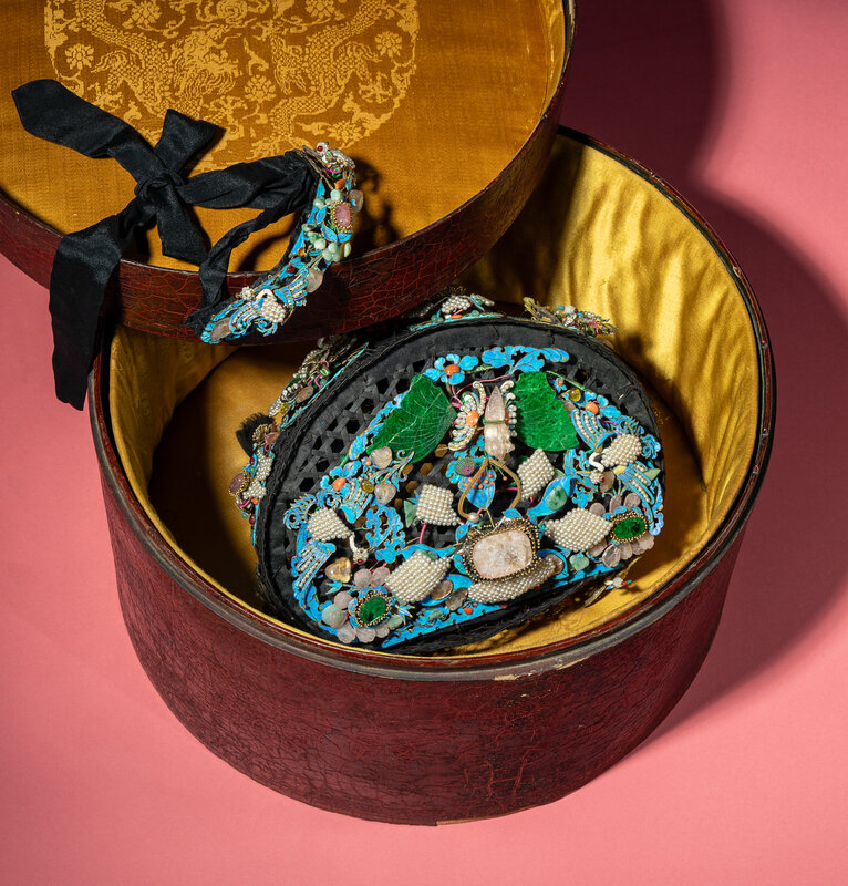 A Chinese Pearl, Jadeite, and Hardstone Ornamented Court Headdress, Dianzi, with Headband, Box, and Four Hairpins, 19th Century