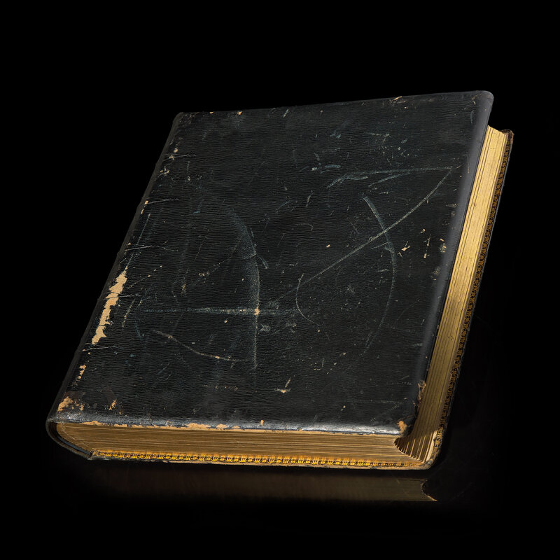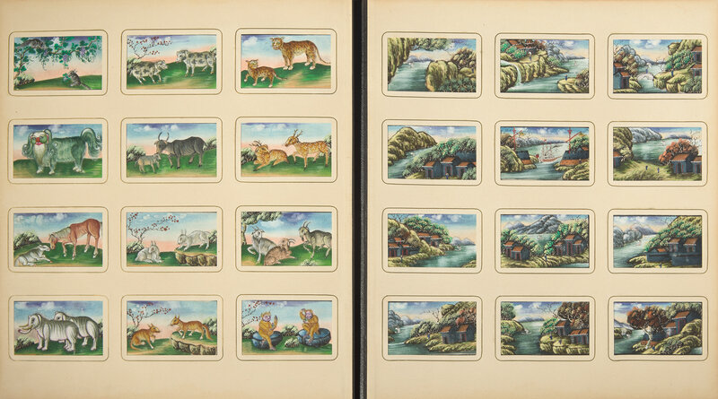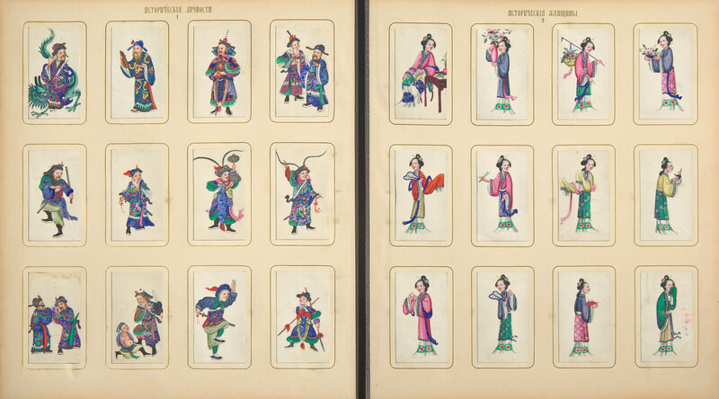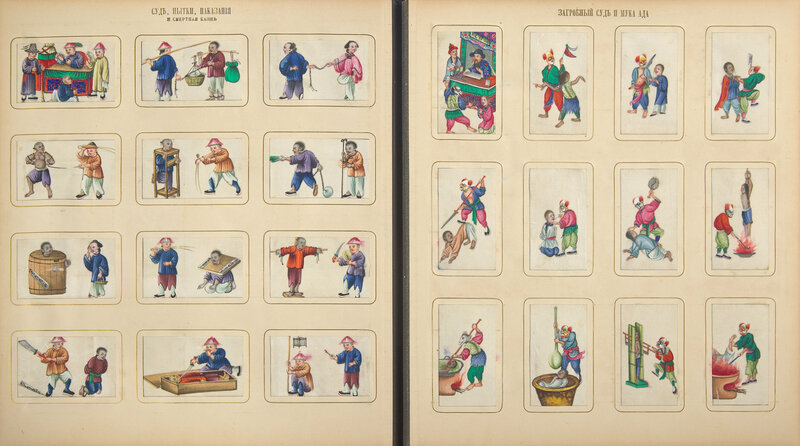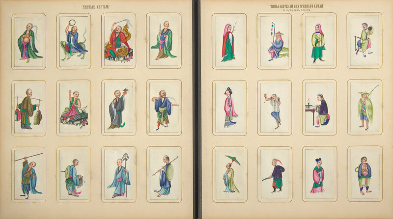 Bound in Russia in black straight-grained morocco, with brown moire endpapers with gold ornamentation, enclosing 26 leaves of heavy card stock, each leaf with 24 "windows" enclosing Chinese gouache paintings on pith paper (one painting lacking), and one additional leaf with 12 "windows", each leaf titled in Cyrillic in gold; the leaves organized by genre/category, including Emperors, Empresses and their court; performers; figures at various occupations; the production of rice, silk, and tea; punishments, both in this world and in Hell; fish; shells; butterflies; "antiques"; landscapes; and animals.