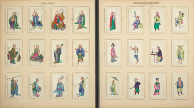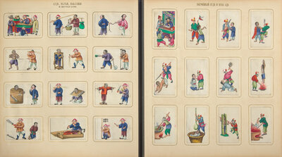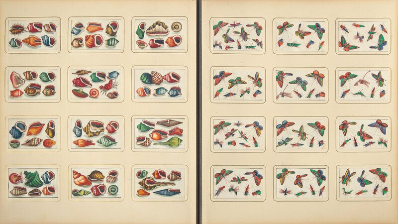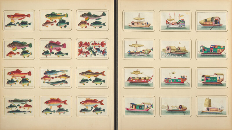 The paintings were probably produced in Canton, where workshops have been creating albums and individual paintings for the western market since the 18th century. Works such as the present paintings, executed in vivid jewel-tone colors on "pith" paper, became popular in the first quarter of the 19th century as more inexpensive and easier to produce than the paintings on canvas and more detailed gouaches produced for earlier clientele. While it is not unusual to find Chinese export albums of twelve paintings on pith paper, such as sets of butterflies, Chinese boats, or notable figures, the sheer scale and range of subjects contained in the present album is unparalleled, and quite possibly unique.