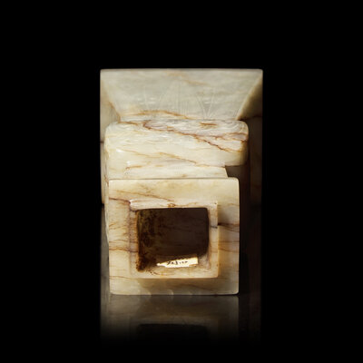 Carved from verigated beige jade, this piece features a finely-carved stylized beast motif on each side of its central section, while the upper and lower registers are adorned with continuous plantain leaf motifs as a deliberate evocation of its bronze age predecessors.