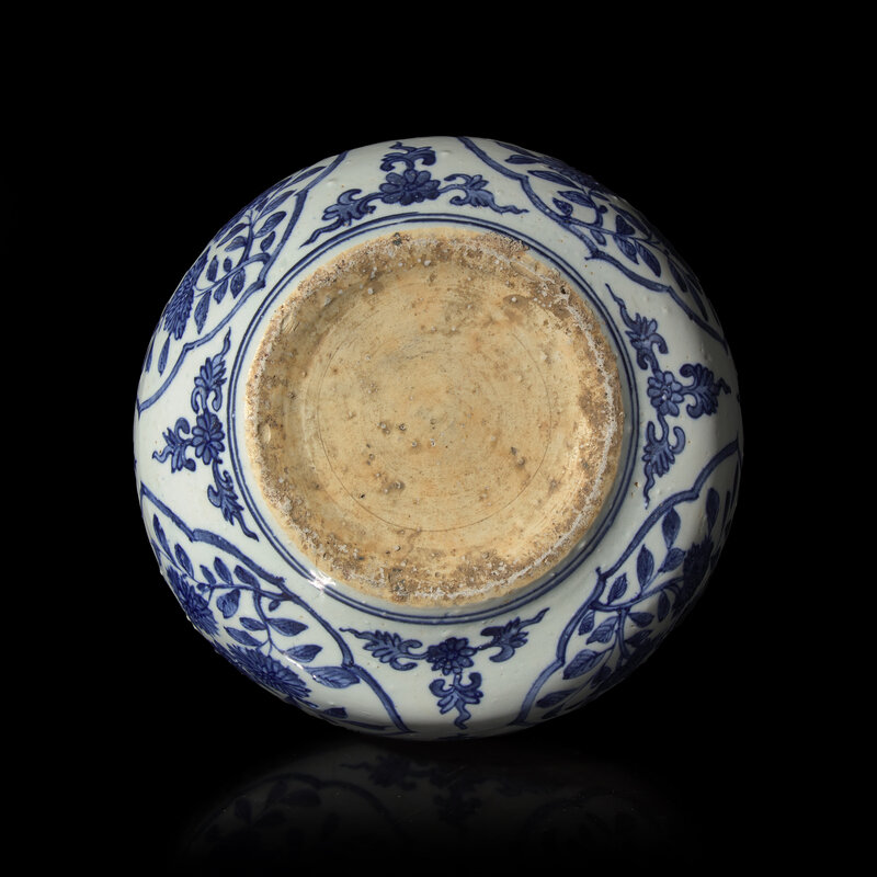The exterior is decorated with blue and white cartouche border enclosing flora and foliage.