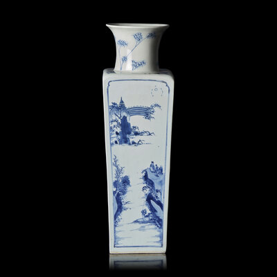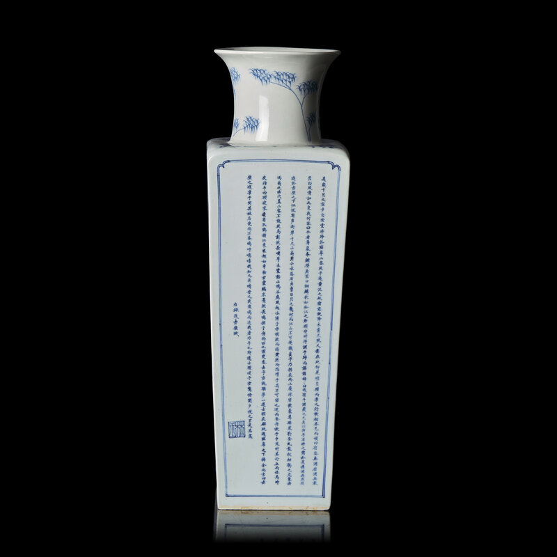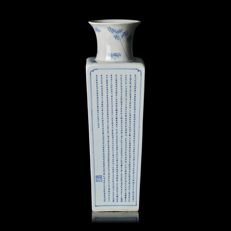 Of tapering square section with waisted neck and flared lip, two opposing sides with extensive river landscapes, one with three figures on a cliff, a bridge and pagoda in the distance, and a fisherman below; the other side with a boating party passing below a precipitous cliff and a pine with trailing vines, a flying crane and the full moon between two constellations in the distance; the two remaining sides inscribed with the Former and Latter Odes on the Red Cliff by Su Shi (1037-1101); underside with six-character Kangxi mark in a recessed square.