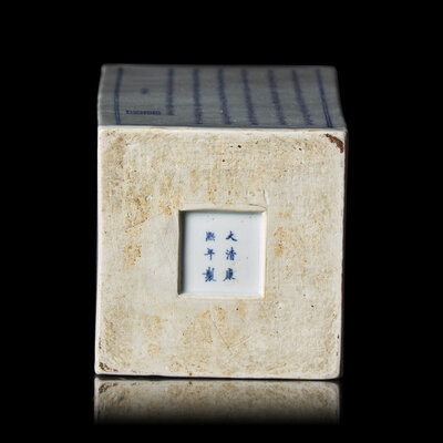 For other examples of this form and type of decoration, see the slightly larger vase from the Butler Family Collection, sold at Christie's Hong Kong, November 29, 2022, lot 2968. See also another vase from the Butler Family Collection, sold at Christie's Hong Kong, November 30, 2023, lot 3040, with an apocryphal Jiajing mark to the underside. For a closely comparable Kangxi mark and period vase with the same seal to the calligraphic sides, see the example sold at Sotheby's Hong Kong, May 12-20, 2025, lot 3383.