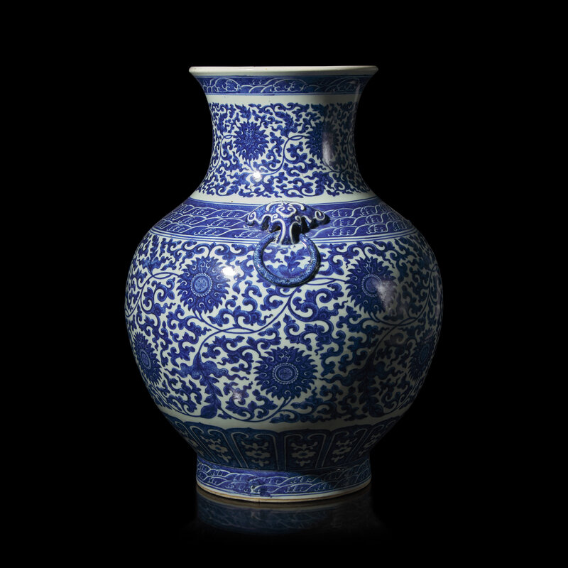 The baluster vase with swelling body, tall waisted neck, all on a straight circular foot, applied with a pair of lion masks and mock ring handles, painted throughout with meandering lotus scrolls, wave bands to the lip, shoulder and foot, with a Qianlong six-character seal mark to the underside.