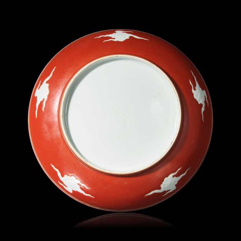 Carved in low relief with four leaping fish swimming among waves on the cavetto, while the center is dominated by a soaring dragon amidst clouds. The exterior features four carved cloud motifs, all against an iron-red ground, and the underside is inscribed with a Xuande six-character mark within a double circle.