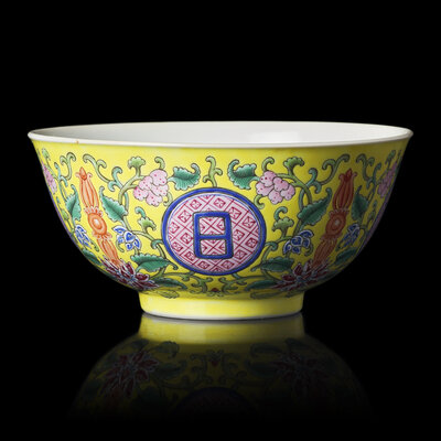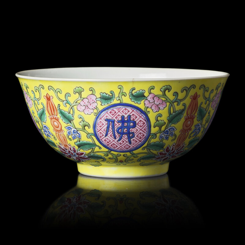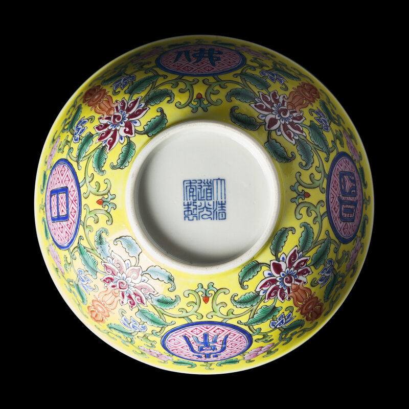 The bowl is decorated on the exterior with an interlocking floral and foliate scroll framing four cartouches centered with the characters Fo Ri Chang Ming “佛日常明” (The Light of Buddha Shines Eternally), all reserved against a yellow ground; the underside with a six-character Daoguang seal mark.