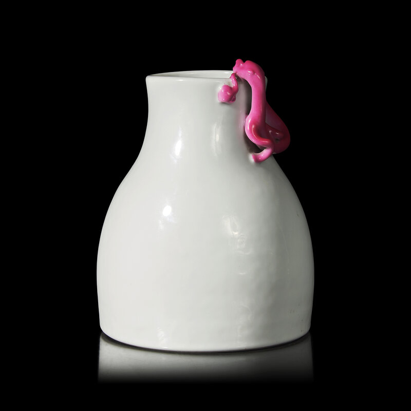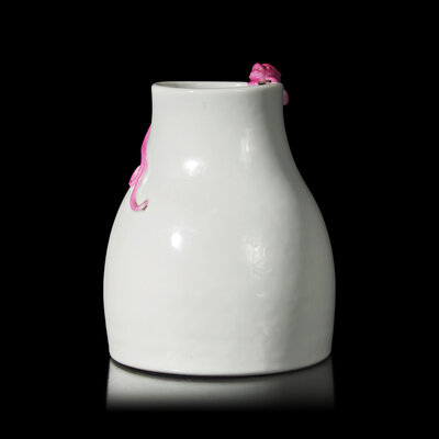 The bag-form vase covered overall in a transparent glaze, the recessed neck decorated with an applied ruby enameled chilong encircling the shoulder; the underside bears a "Yu Xiu Xuan Zhi" mark in a line.