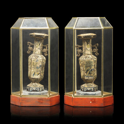 Each faceted vase on a raised base, the straight neck flanked by a pair of stylized bat-shaped handles, topped with a galleried mouth, the silk exquisitely embroidered with various birds, flowers, and auspicious symbols, now set in modern display cases.