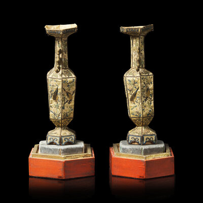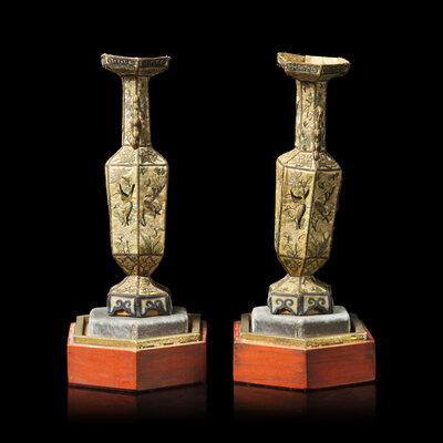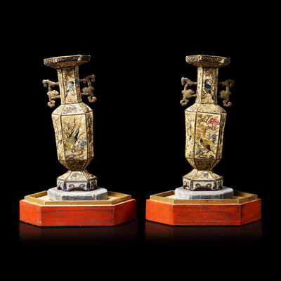 清晚期 粵綉拼接六方賞瓶一對