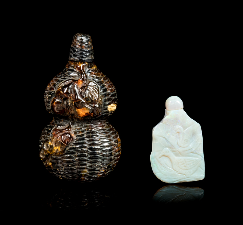 the first an amber example, of gourd-form, the second an opal example with ducks.