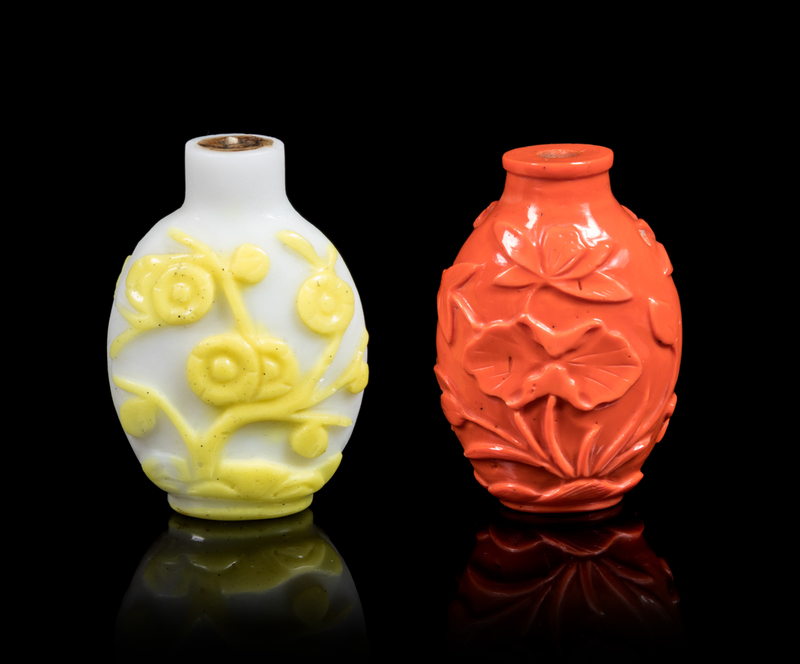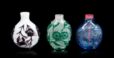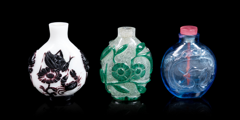 Five Chinese Peking Glass Snuff Bottles Height of tallest 2 1/2 inches.