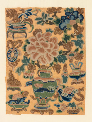 one depicting flower-filled vases against a yellow ground, framed; the other a roundel showing a boy riding on the mythical beast Qilin, framed.