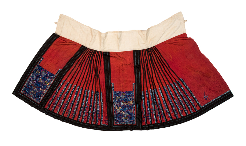 A Chinese Red Ground Embroidered Silk Skirt Length 36 inches.