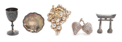 comprising a black lacquered silver dish, a figure of a torii, and two figures of fruit, together with cup.