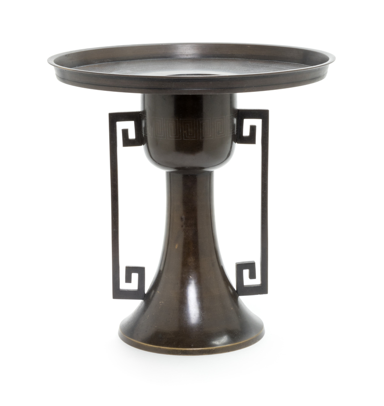 with a band of Greek key motif around its waist and flanked by two handles wo either side.