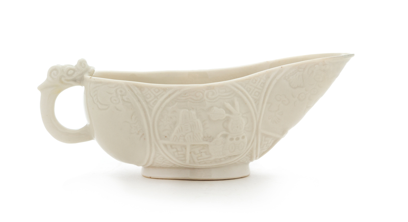 A Chinese Blanc-de-Chine Porcelain Libation Cup Length 5 1/2 inches.