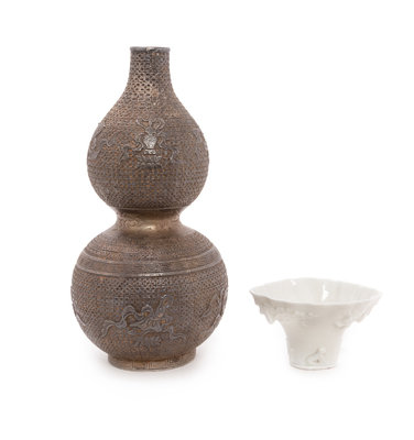 the first a blanc-de-chine libation cup, the second a gourd-form vase carved with ribbon-tied auspicious symbols, the underside impressed with an apocryphal Qianlong six-character mark within a rectangular panel.