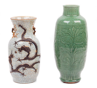 the first a longquan celadon glazed vase with floral decoration, the second a iron decorated crackle ground vase with dragon decoration.