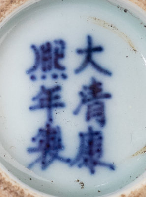 covered in a crushed strawberry glaze with green speckles, the underside bearing an apocryphal Kangxi six-character mark in underglaze blue, having a matching stand.