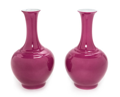 A Pair of Chinese Ruby Red Glazed Porcelain Bottle Vases Height 8 3/4 inches.