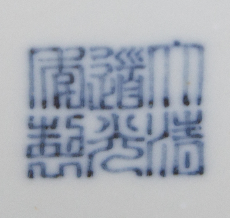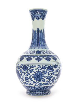 the ovoid body painted with meandering lotus branches and leafy vines between ruyi heads and radiating lappet leaves repeating to the neck, the flared mouth decorated with wave motifs, bearing a Daoguang six-character mark in underglaze blue to the underside.
