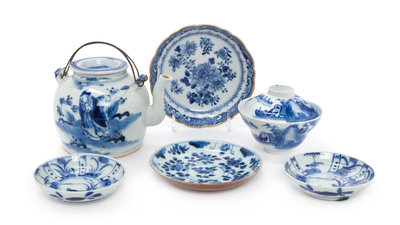 Six Chinese Blue and White Glazed Porcelain Articles Height of teapot 3 3/4 inches.