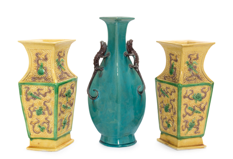comprising a turquoise glazed example and a pair of sancai glazed examples.
