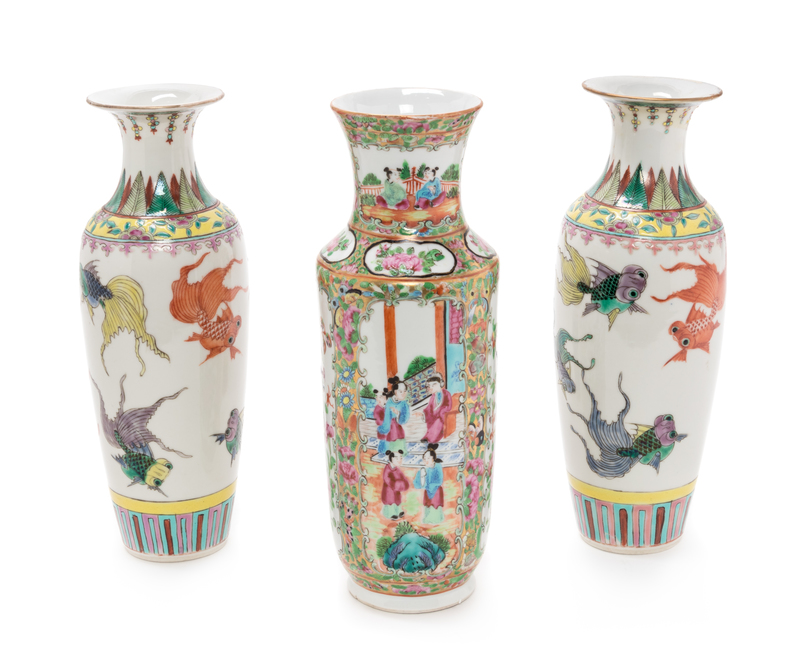 comprising a pair of vases with gold fish decoration, a rose medallion vase with figures amongst floral scrolls.