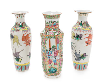 Three Chinese Famille Rose Porcelain Vases Height of tallest 10 inches.