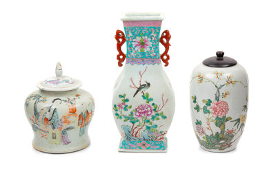 Three Chinese Famille Rose Porcelain Articles Height of tallest 11 7/8 inches.