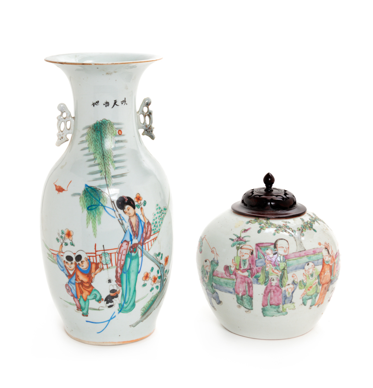the first a ginger jar, the second a baluster vase, each with figural decoration.