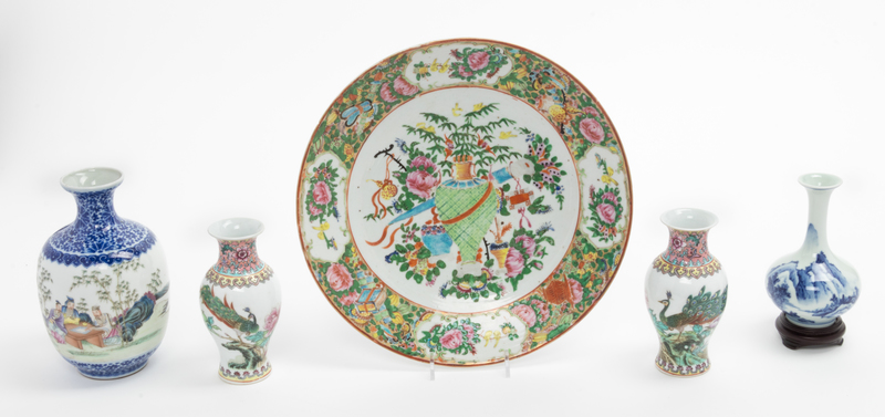Five Chinese Porcelain Articles Diameter of largest 11 1/2 inches.