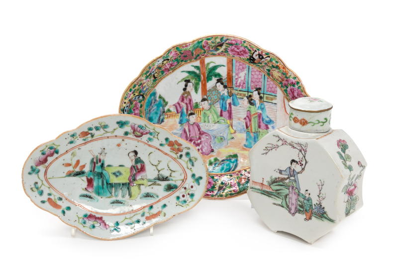 the first a rose medallion stem plate, the second a famille rose stem plate, the third a tea caddy.