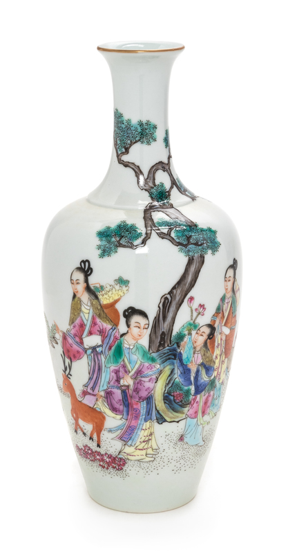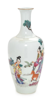 A Chinese Famille Rose 'Ladies in the Garden' Porcelain Bottle Vase Height 8 1/4 inches.