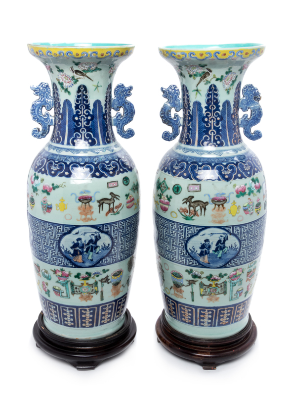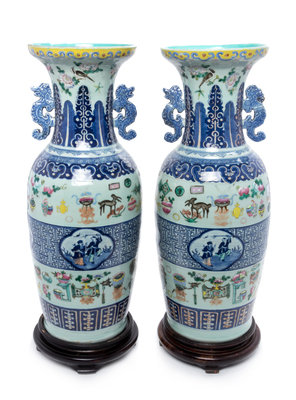 A Pair of Chinese Celadon Ground Underglazed Blue and Famille Rose Porcelain Vases Height 24 inches.