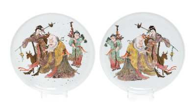 each of circular form, painted to the front showing the immortal of longevity, a lady and an attendant.